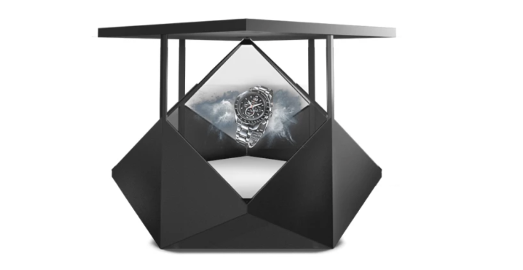 Vous tenez une bijouterie ? Optez plutôt pour une pyramide à 3 ou 4 côtés pour représenter un ou plusieurs hologrammes de vos modèles de bijoux. Ces modèles seront modélisés en 3D photoréaliste et remplaceront vos bijoux qui resteront de facto à l’abri. Une pyramide peut « contenir » plusieurs modèles 3D, il suffit d’y accoler une interface pour naviguer entre les différents modèles pour obtenir un véritable catalogue holographique de vos collections.